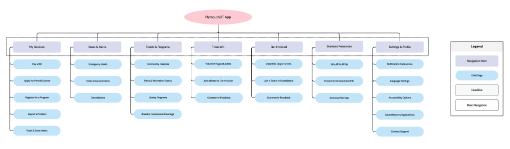When planning the IA for the PlymouthCT app, I began my identifying the primary needs of the users who are most likely to access municipal information on the go. These are people who want to complete specific tasks quickly and not necessarily read through dense pages of government material. With that, I grouped key actions and information into five main categories, each designed to serve a distinct user need: