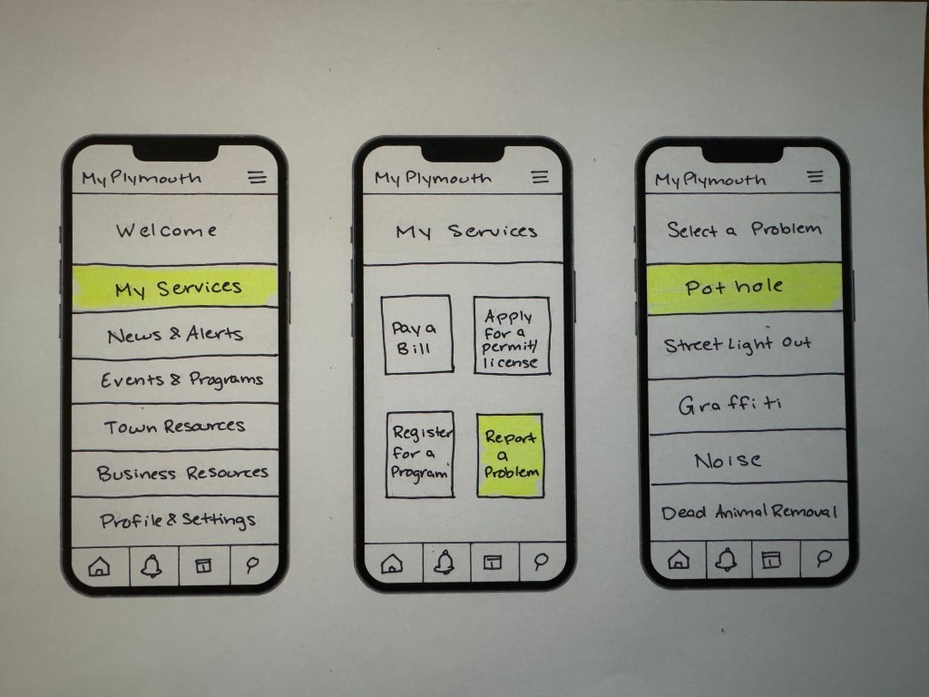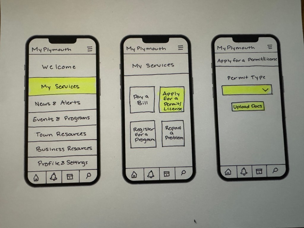 This week we dive into the world of paper prototyping – a fast and surprisingly effective method for visualizing user flows and interfaces without opening a design program. It takes all of the strategies that have been built so far – sitemaps, information architecture, and user flows – and begin to make them come alive. The MyPlymouth app helps connect residents and business owners to their local government’s services. The user experience needs to be simple and intuitive for the different types of people using the app.