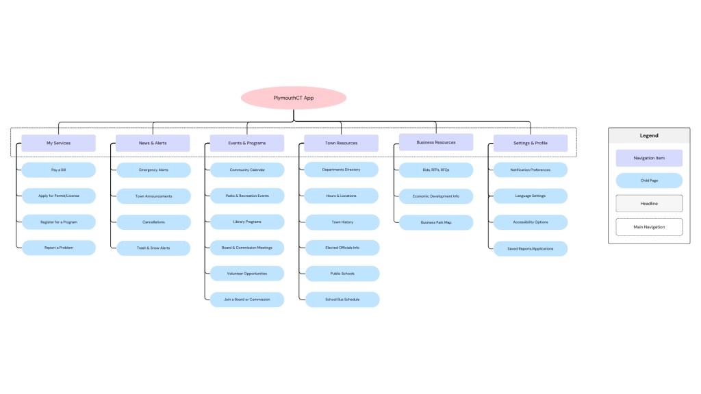 The sitemap for the MyPlymouth app went through some minor tweaks after careful consideration of what users would need to be able to do. The major categories on the home screen now direct users to: