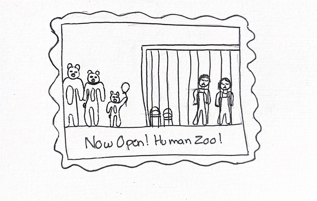 In my game of The Thing from the Future, I drew the cards: a transformation future, related to the zoo, and a postcard. I imagined a world where the animals evolved to the point of taking over the humans. In this future, the humans were placed in zoos, like how we do to animals now, and were looked upon for pure entertainment. The humans in the cage are sad because of the conditions they live in. A family of bears watches them while the child bear holds a balloon to symbolize that they are there for fun. The postcard itself says, “Now Open! Human Zoo!” to advertise that the new attraction is open and to draw in more visitors.