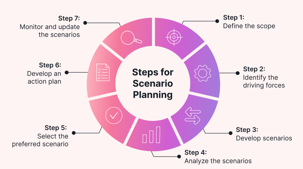 Scenario planning began as a method for business and strategic forecasting, but has quickly become a creative process for designers. Instead of predicting a singular future, it brings many to life. The Great Lakes Integrated Sciences and Assessments (GLISA) group defines it as a process for managing uncertainty by developing a set of plausible scenarios. For visual designers, that means imagining how interfaces, spaces, or experiences might look in different worlds depending on growth, collapse, discipline, or transformation. A designer can storyboard these worlds to look at near and far off futures. This turns visual design into a means of storytelling that stretches across both time and space.