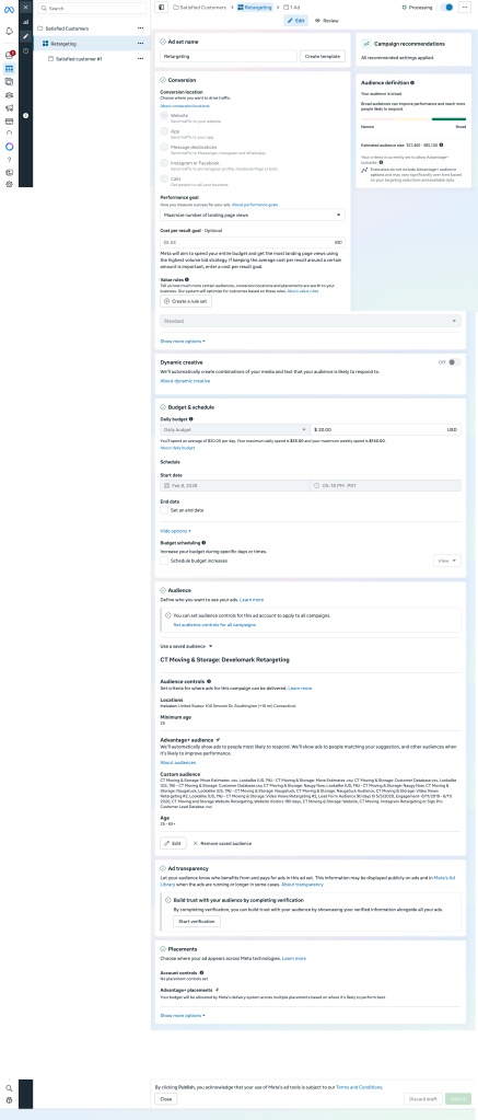 While learning how to properly set up a Meta Ads campaign, I had the opportunity to work on CT Moving and Storage, a real client at Develomark. The objective was to create a retargeting campaign that re-engages users that are already familiar with CT Moving’s brand and urges them closer to a conversion.