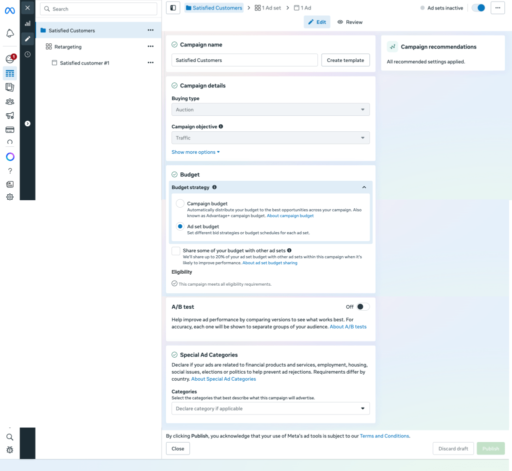 I handled the budgeting decisions at the ad set level. I chose a daily budget to maintain consistent exposure rather than spend everything all at once. This is useful for retargeting where frequency and sustainability matter.