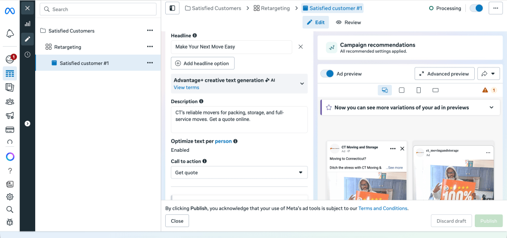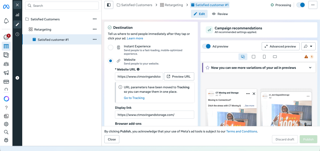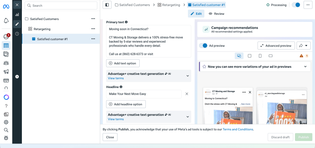At the campaign level, I selected the Traffic objective. While conversions are often the end goal, traffic made sense here because the audience already had prior exposure to CT Moving and Storage. The focus was on driving qualified visitors back to the website to request a quote or learn more about services. Using an auction buying type ensured Meta could optimize delivery efficiently within the set budget.