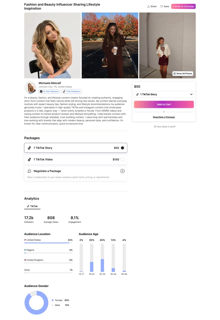 Michaela fits Zara’s brand because she is a micro-influencer with a strong engagement rate. She is well positioned to drive high quality interaction (comments, shares, and saves) through try-on and styling content. Based on her Collabstr profile she has: