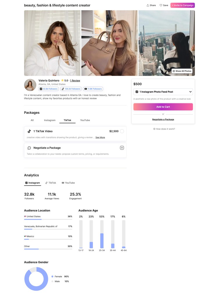 For influencer discovery and collaboration, I used Collabstr to source the influencers. The two creators that I selected align with Zara’s target audience; fashion forward, primarily women, and heavily Gen Z/Millennial.