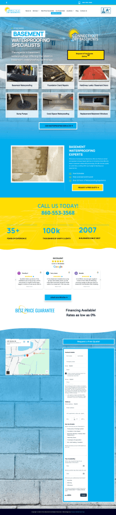 CT Dry Basements is a Connecticut based basement waterproofing company that offers services like sump pumps, crack repair, and crawl space solutions. Their site communicates their credibility and experience very well. However a closer look at the UX shows several usability issues that could be impacting their conversions.
